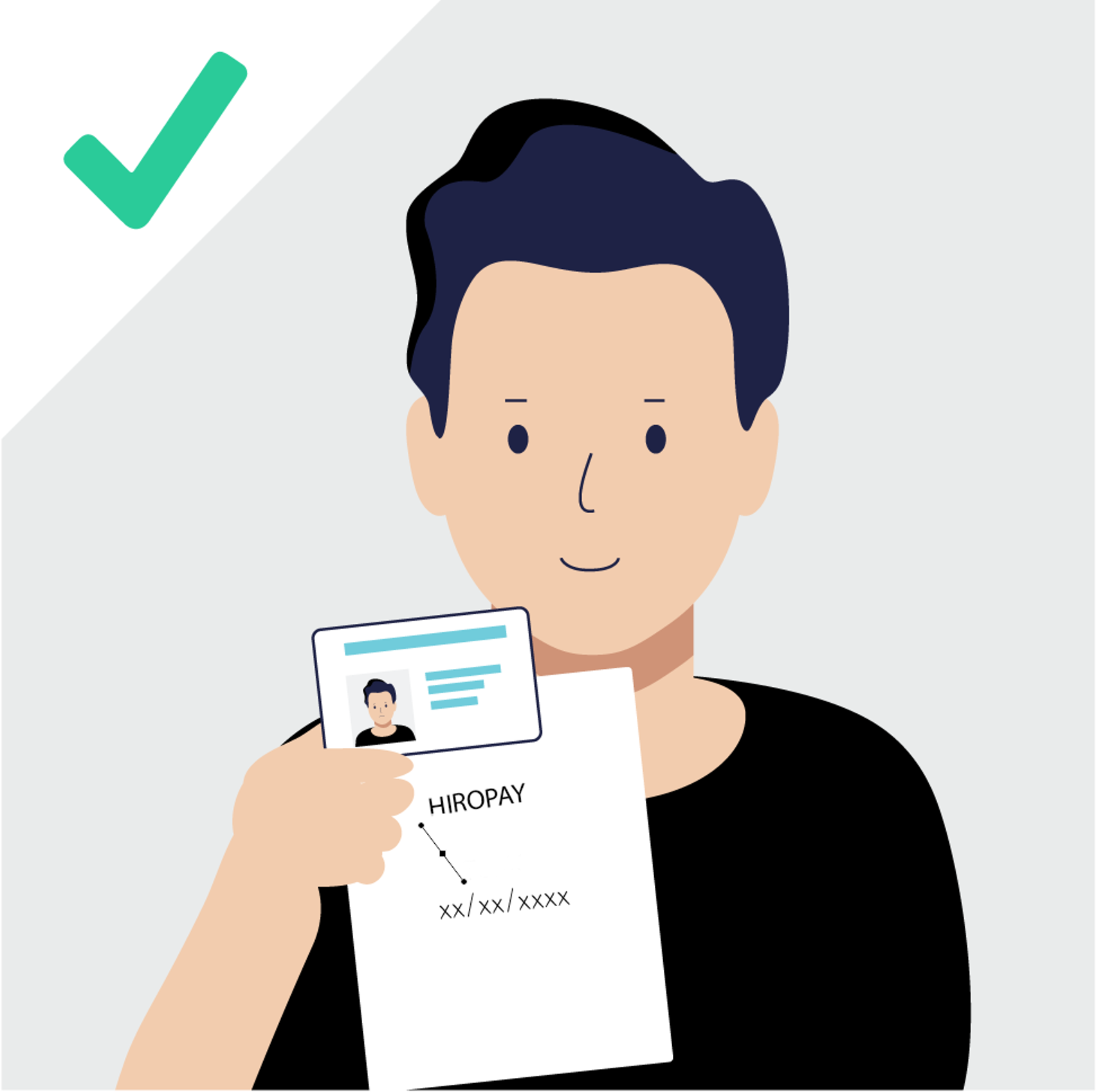 SELFIE de vous tenant votre piece d'identité et un papier sur lequel c'est écrit HIROPAY et la date d'aujourd'hui